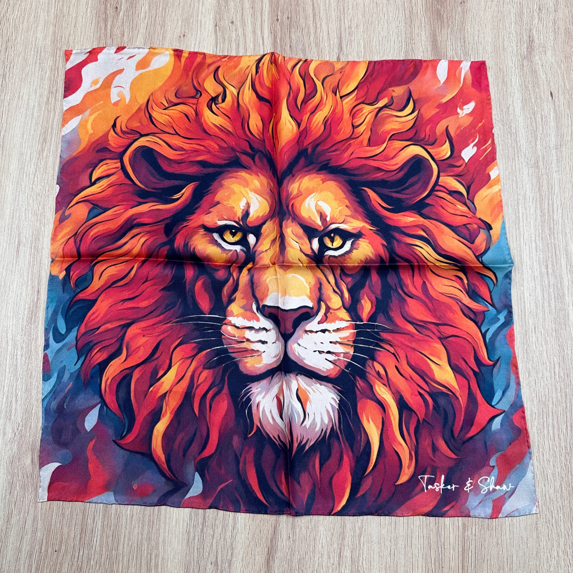 Our Lionheart silk pocket square makes a masculine and exuberant statement. This luxury silk square features our lion logo reimagined. The mix of colours and shapes within the print makes it infinitely versatile, with a fold for every outfit.