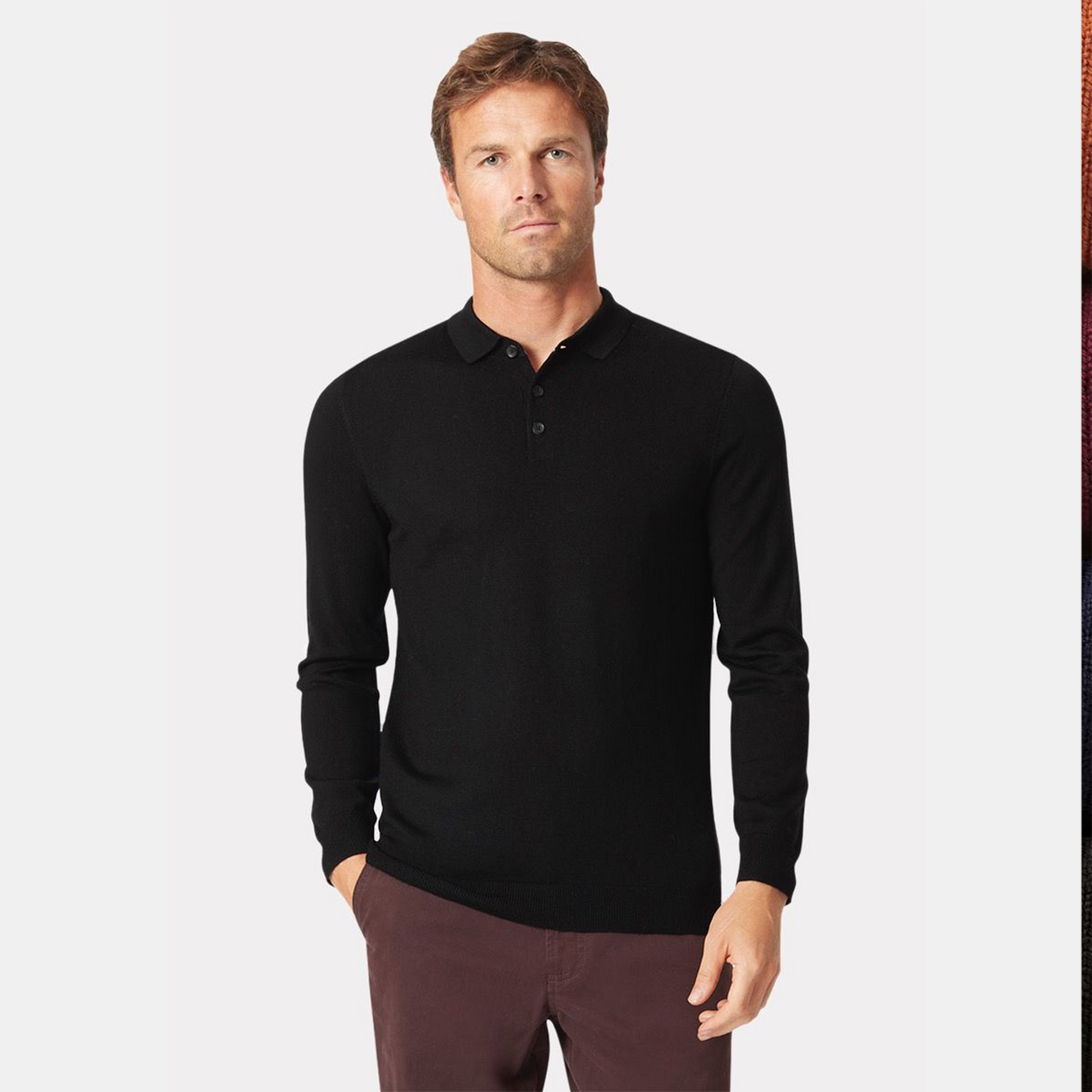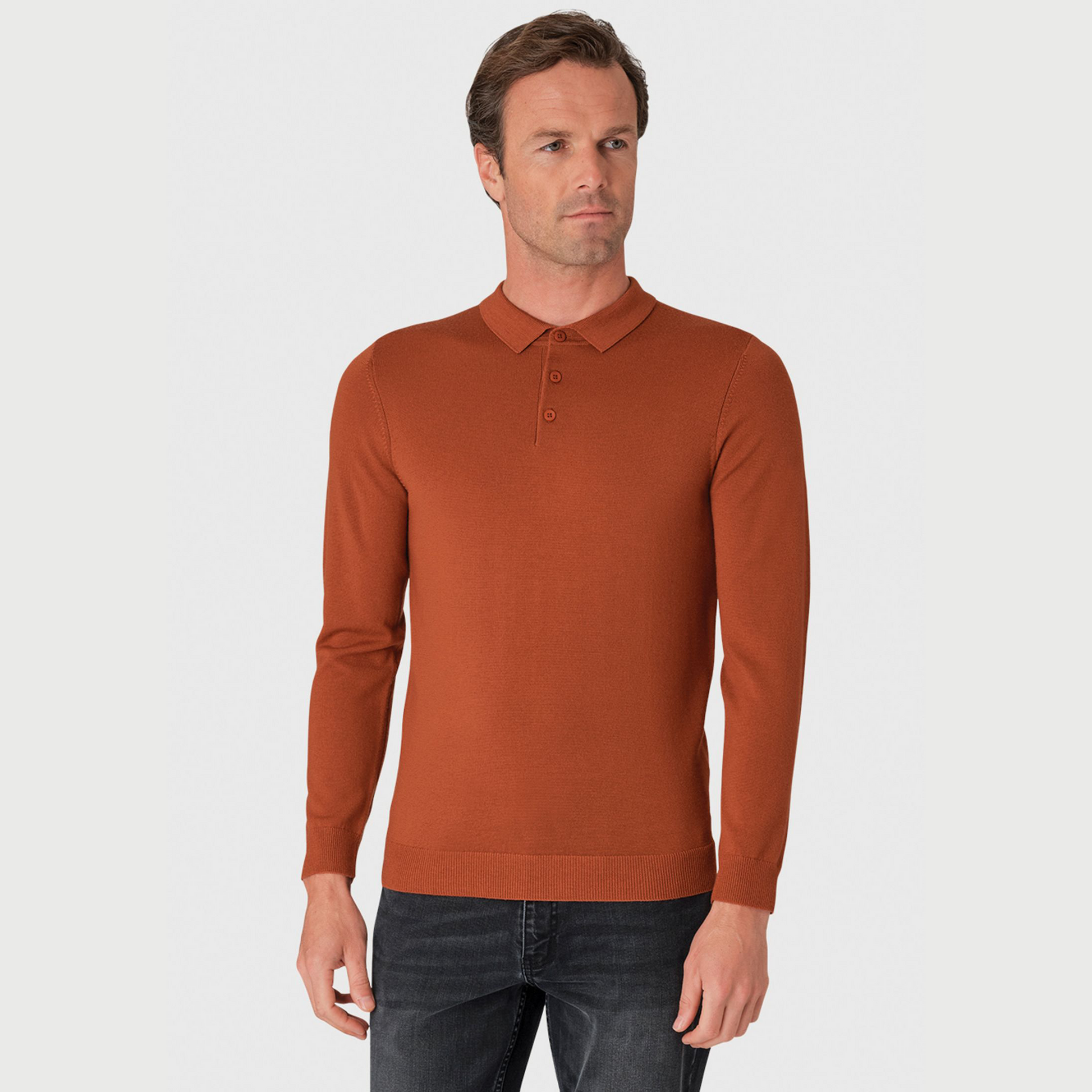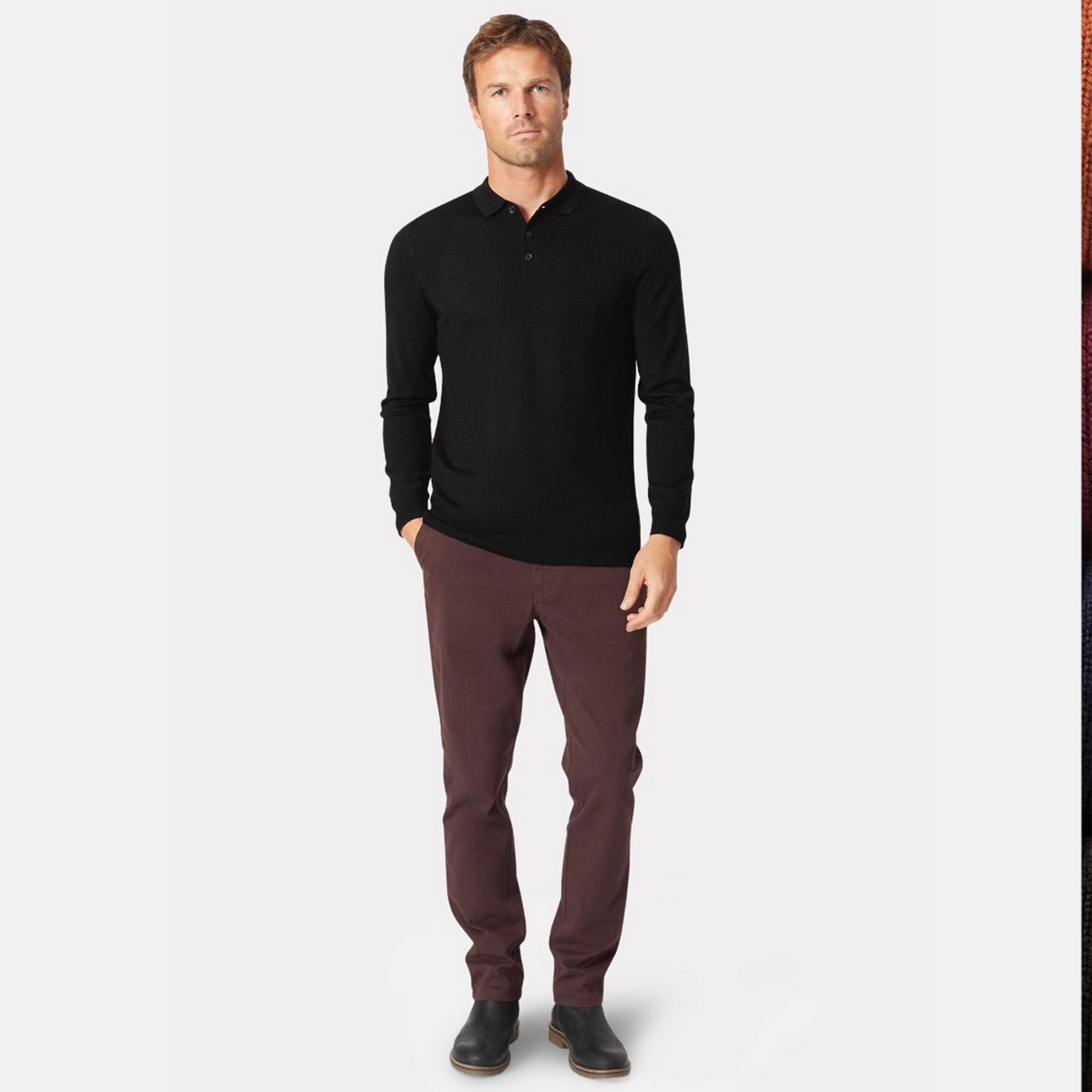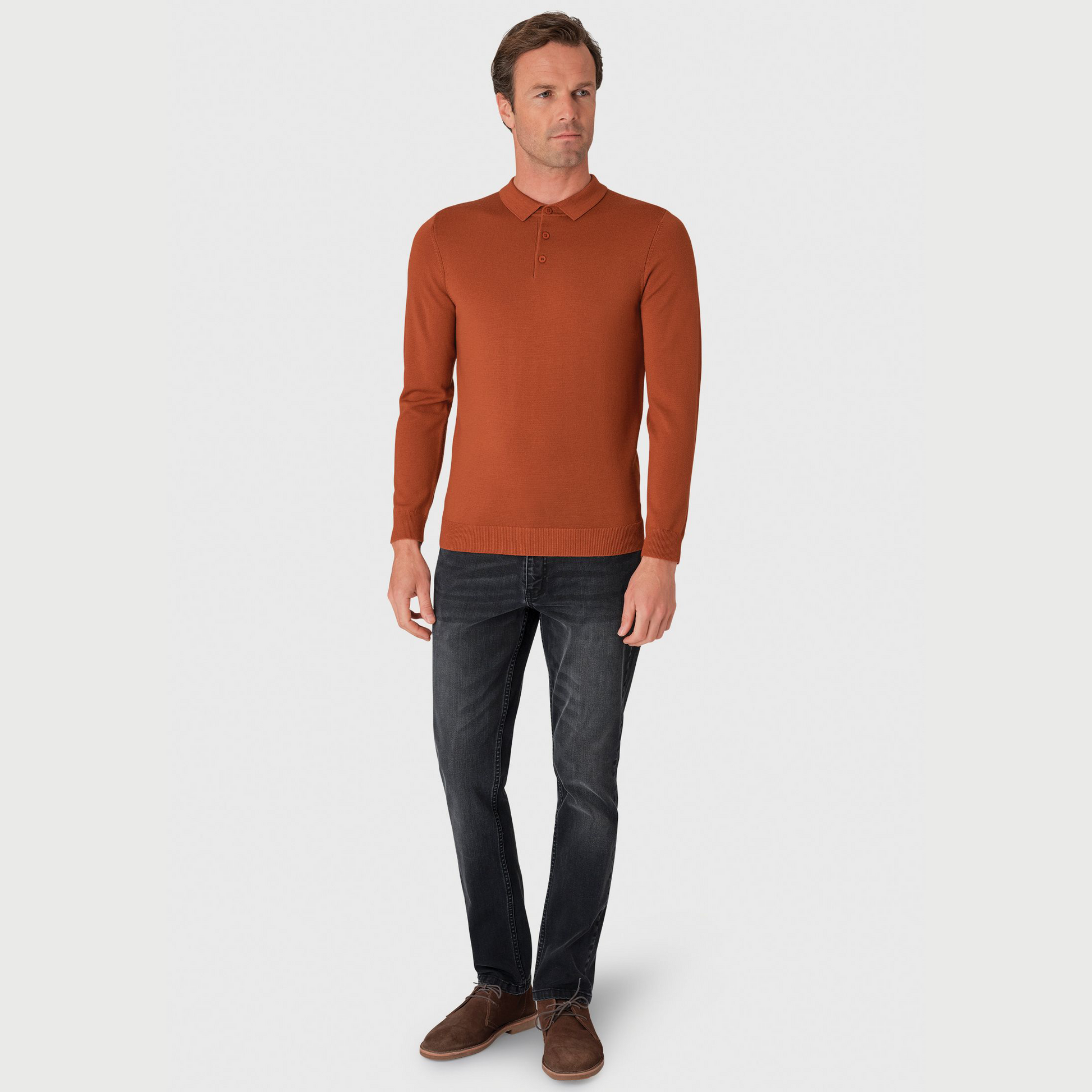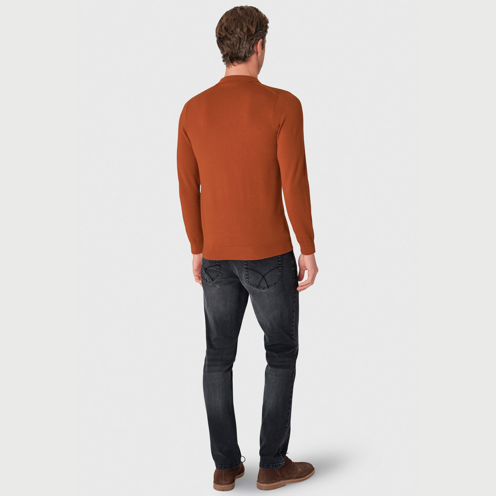 This polo shirt is knitted from 100% Merino wool and is available in four colours; Navy, Black, Wine and Burnt Orange.