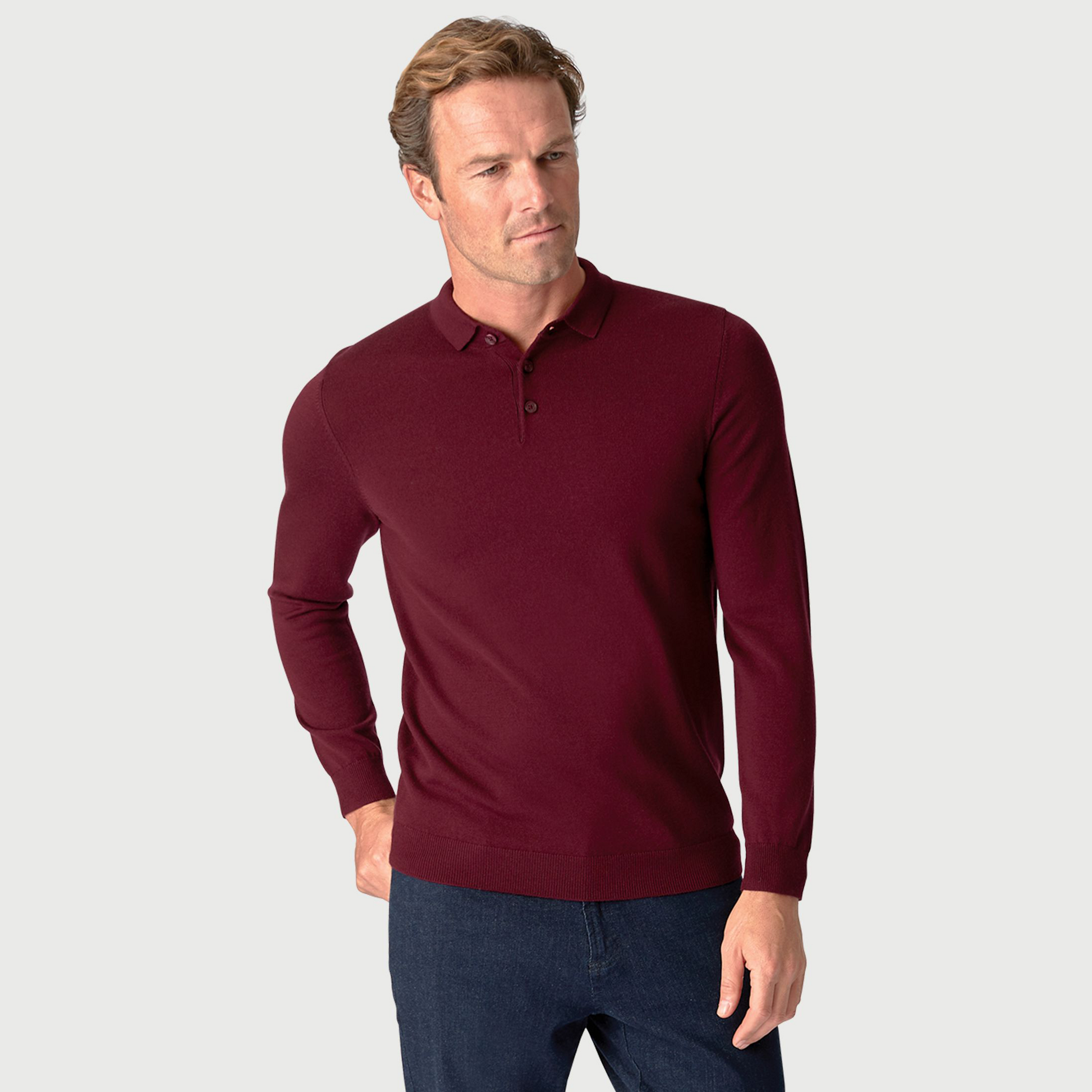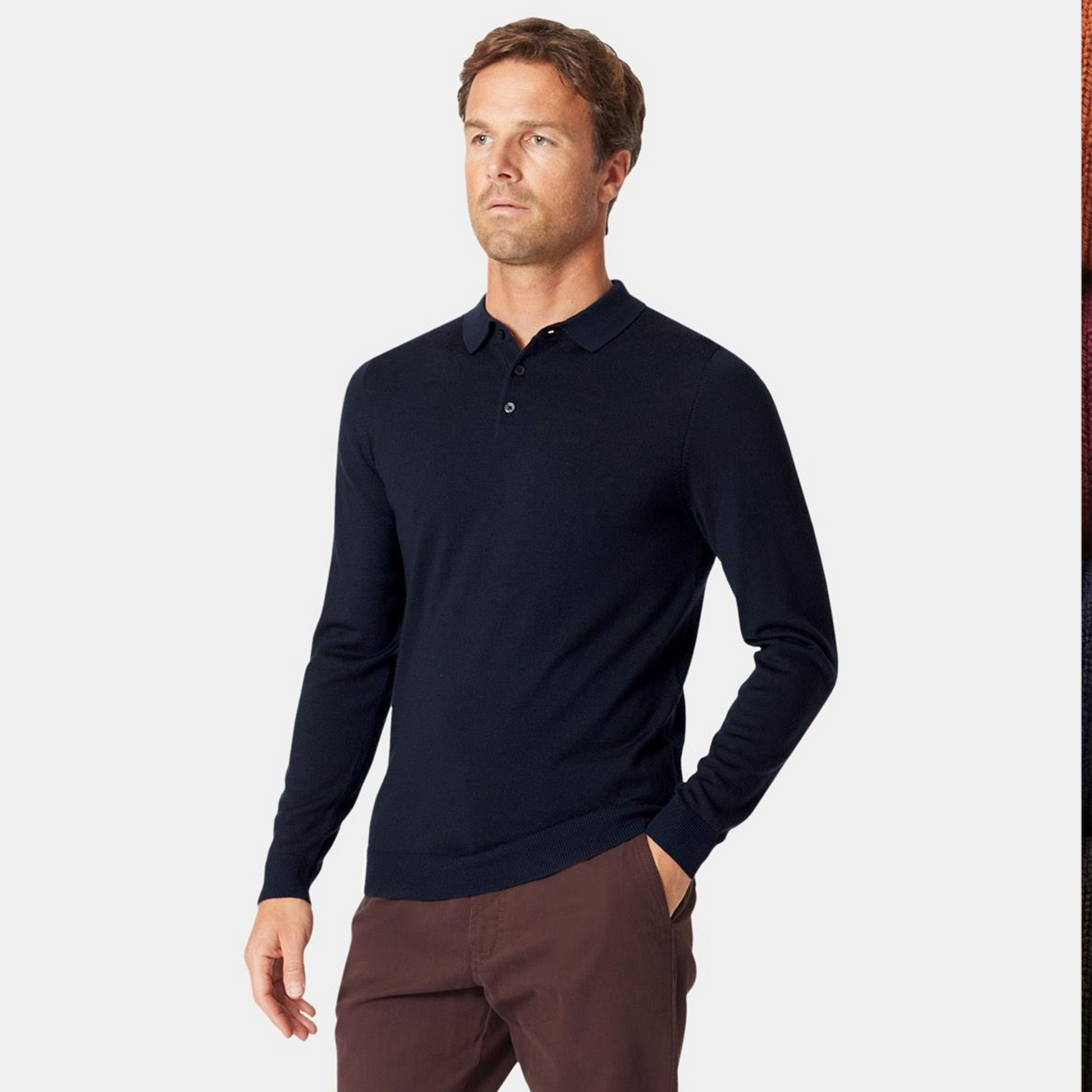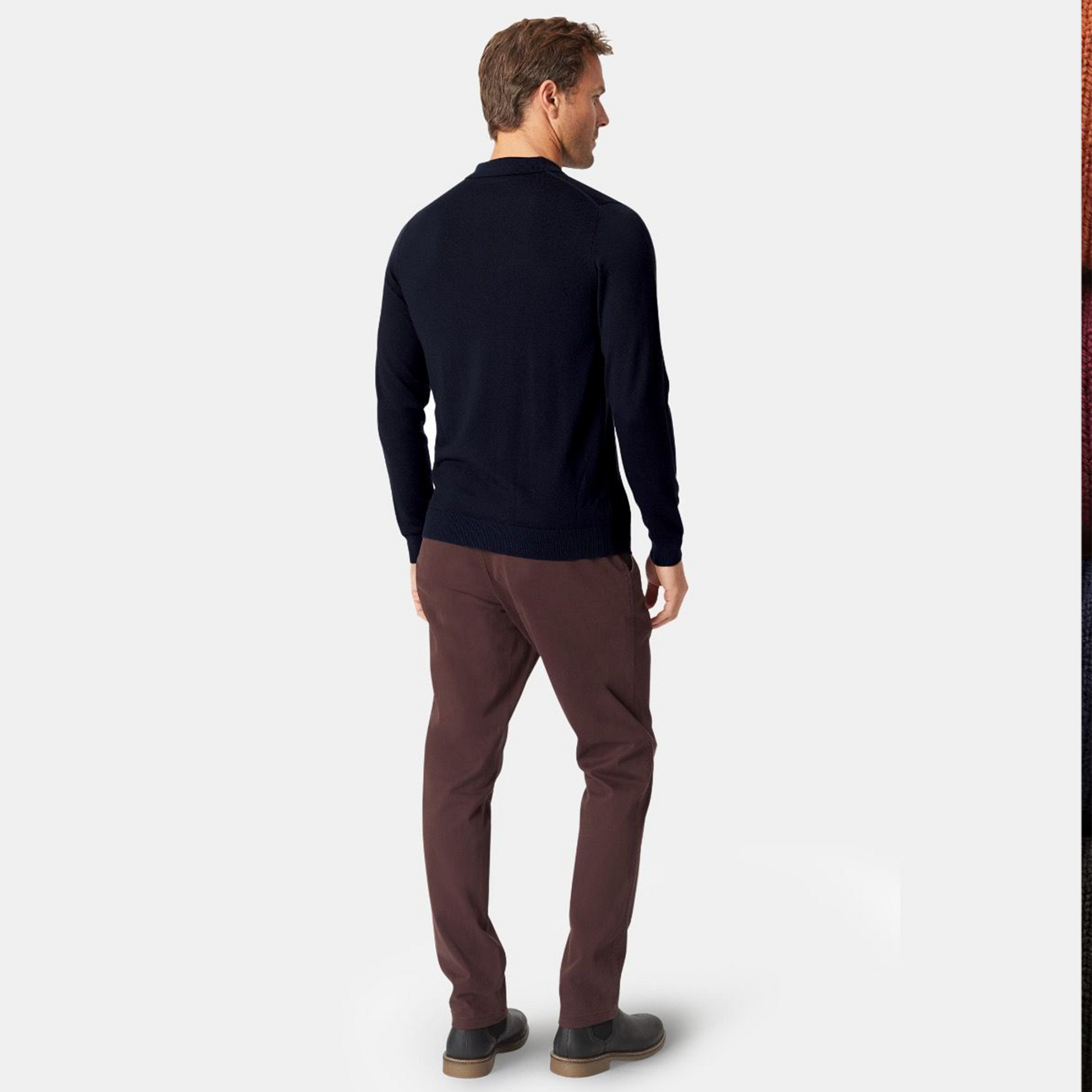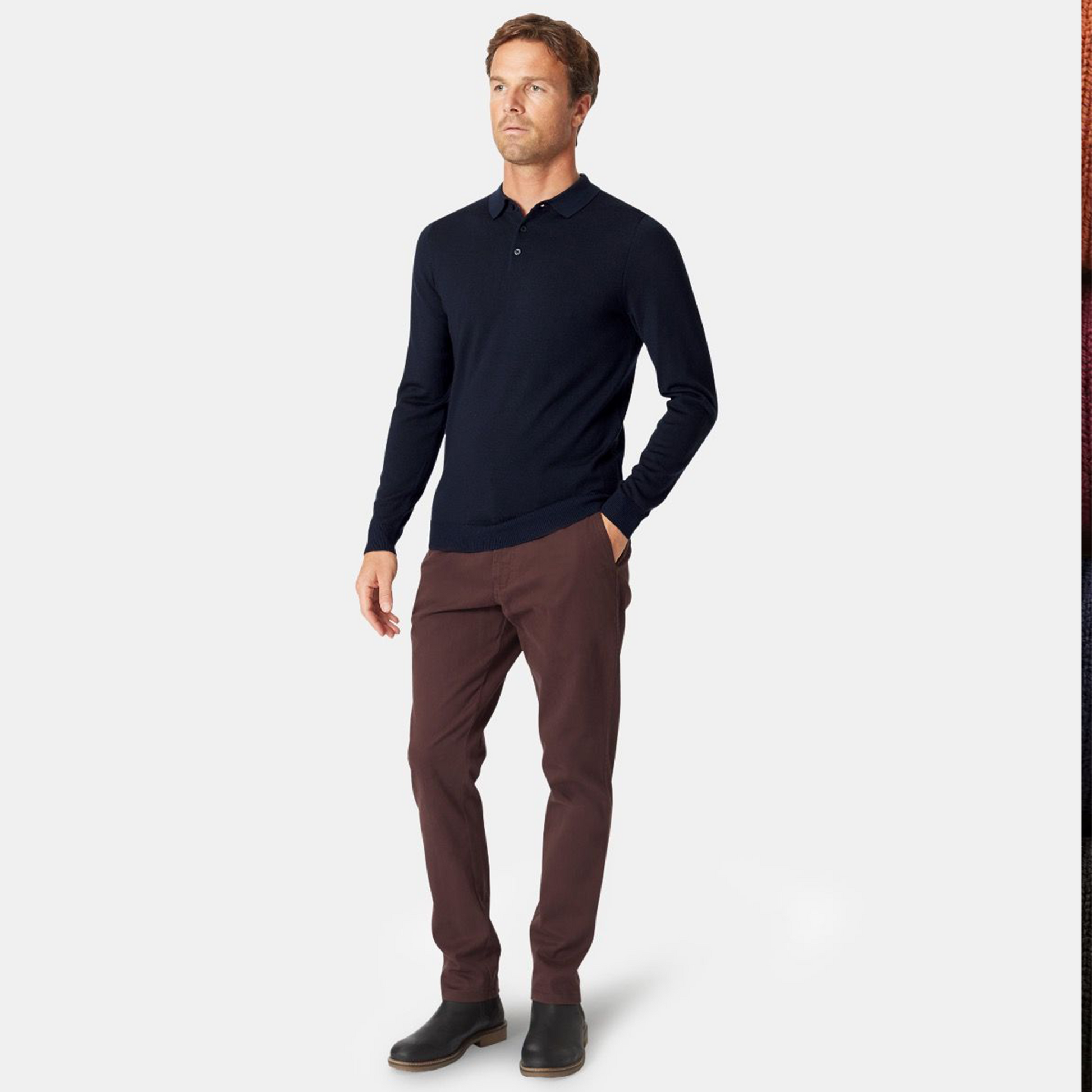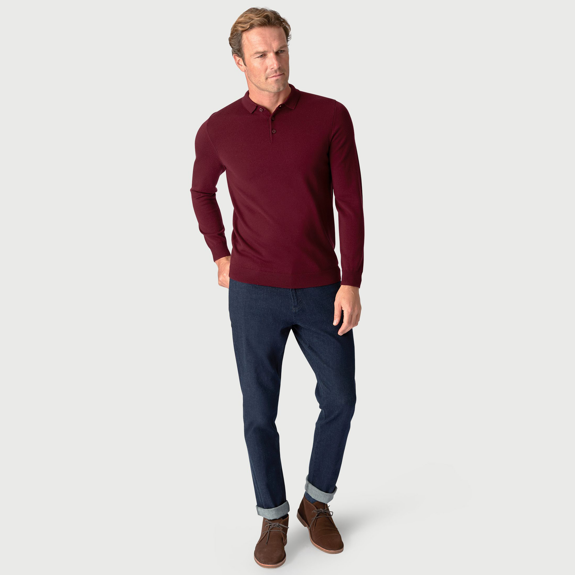 This polo shirt is knitted from 100% Merino wool and is available in four colours; Navy, Black, Wine and Burnt Orange.